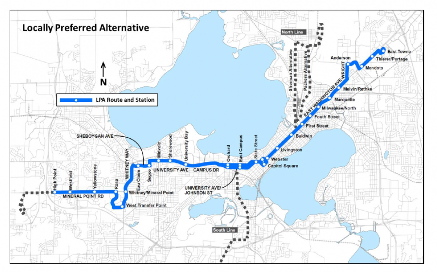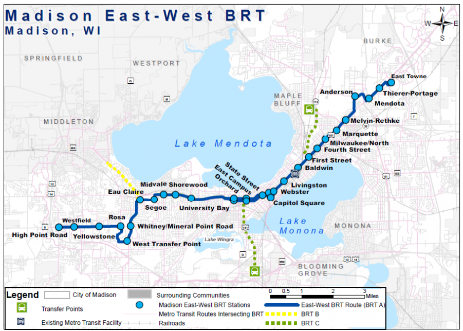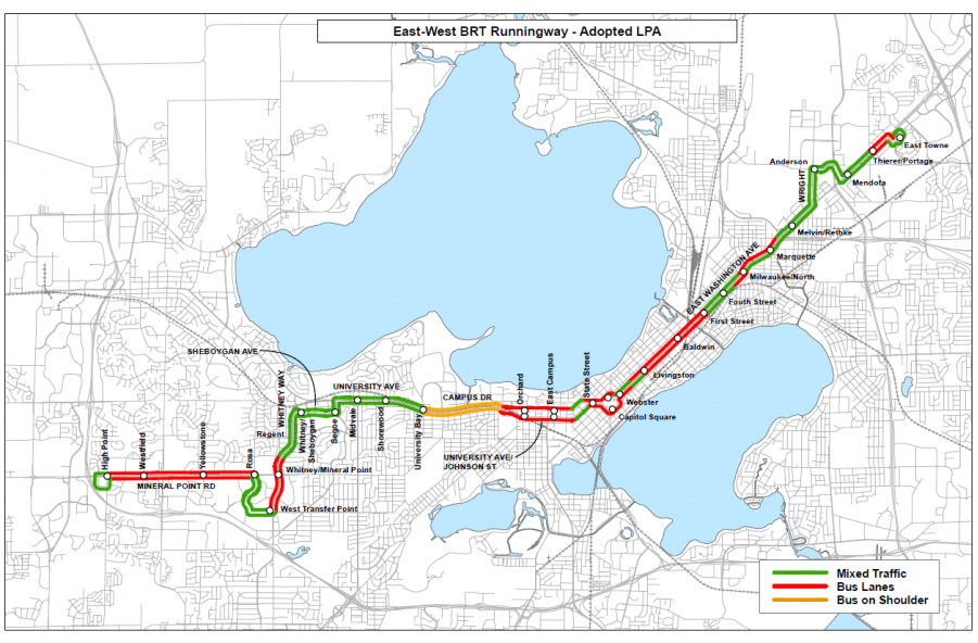 BRT A – Runs east to west from East Town Mall to High Point Rd. mainly along East Washington Ave, University Ave, and Mineral Point Rd.